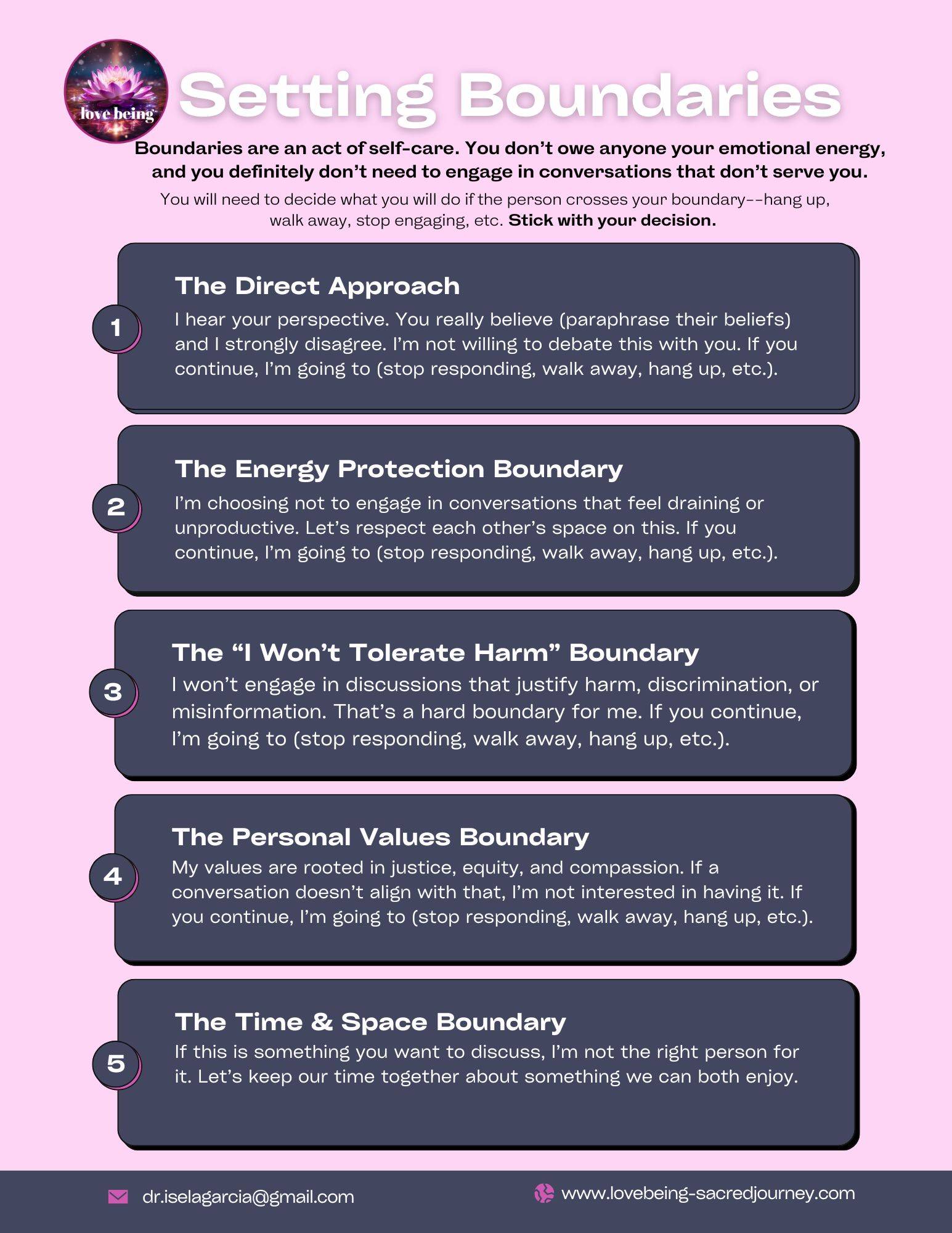 Download Setting Boundaries and learn a few key phrases that will help you establish firm boundaries. Remember, you don't owe anyone your emotional energy and you don't need to engage in conversations that don't serve you. 💜